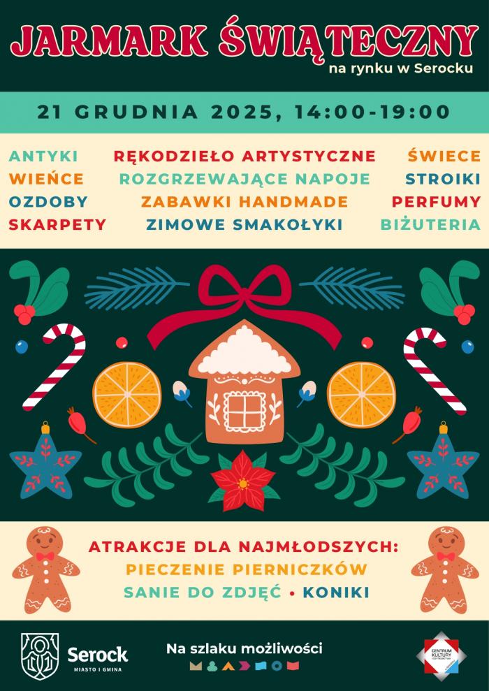 Już 21 grudnia 2025 roku , w godzinach 14:00–19:00 , Urząd Miasta i Gminy w Serocku serdecznie zaprasza na wyjątkowy Jarmark Świąteczny , który odbędzie się na serockim Rynku. To niezwykła okazja, aby poczuć magię zbliżających się Świąt Bożego Narodzenia, spotkać się we wspólnym gronie i przygotować do tego wyjątkowego czasu. [middle1] Lokalni rzemieślnicy i tradycyjne wyroby Na Jarmarku swoje dzieła zaprezentują lokalni twórcy i rzemieślnicy , którzy przygotują szeroki wybór tradycyjnych ozdób, rękodzieła, świątecznych dekoracji, ekologicznych produktów i naturalnych wyrobów spożywczych . To idealna okazja, aby zakupić wyjątkowe prezenty świąteczne – unikatowe, stworzone z pasją, sercem i w duchu lokalnych tradycji. Atrakcje dla dzieci Najmłodsi również znajdą coś dla siebie! Dla nich przygotowano m.in.: przejażdżki na uroczych kucykach , warsztaty świąteczne , podczas których będą mogli własnoręcznie wykonać ozdoby lub małe podarunki. Występy i koncerty Świąteczną atmosferę dopełnią występy artystyczne , w tym: koncert zespołu góralskiego , który przeniesie nas w klimat ludowych świąt, występy młodzieży oraz scholi parafialnej , które zaprezentują najpiękniejsze kolędy i pastorałki. Smaki i aromaty Świąt Na odwiedzających czekać będą także rozgrzewające napoje i smakołyki , wśród nich: gorąca czekolada , grzane wino , oscypki, grzaniec bezalkoholowy , idealne na chłodne popołudnie i zimowy spacer. Wspólne życzenia i łamanie opłatkiem Kulminacyjnym momentem serockiego Jarmarku będzie wspólne łamanie się opłatkiem , pełne życzliwości i świątecznego ciepła. Razem złożymy sobie bożonarodzeniowe życzenia , łącząc się w atmosferze wspólnoty i nadchodzącej radości Świąt. Serdecznie zapraszamy wszystkich mieszkańców Serocka i okolic! Przyjdź, poczuj magię, zabierz ze sobą świąteczny uśmiech i przygotuj się na pełne serdeczności Święta Bożego Narodzenia.
